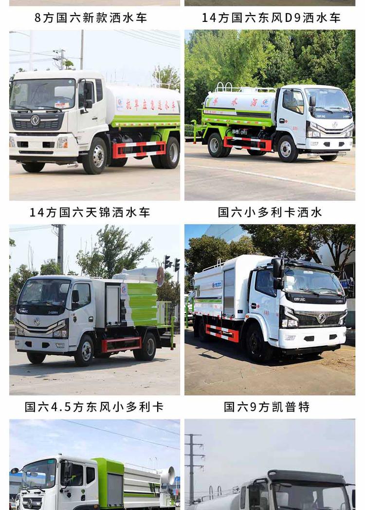東風多利卡國六D9程力標準化12方灑水噴頭頂部配置:罐體采用4mm武鋼碳鋼板,罐體容積12立方米,罐體內隔板防波。專用自排水自吸灑水泵、前沖、后噴、側噴、后工作平臺、360度可調綠色水炮、自流閥、濾網(wǎng)、消防栓(取水可接消防栓,緊急可用于滅火)、罐前測量管(觀察罐內部的水位)、罐后爬梯、罐的罐口、簡易護欄、兩根泵管、雙罐面層噴漆過程中,東風多利卡國六D9程力,標準化了12個方形噴頭的可選配置:霧**機、電子水炮、箭燈。