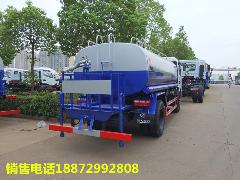 隨底盤選裝駕駛室;品名:水,密度:1000千克/立方米,有效容積7.9立方米,罐體尺寸(長×寬×高)(mm):4200×1980×1280;ABS系統生產廠家,型號 : 吸程≧7米,灑水寬度≧14-16米,射程≧25-30米,引水時間<5min,流量60m3/h。前沖(噴)、后灑、帶側噴(花灑)、帶后工作平臺、平臺上安裝綠化灑水高炮(炮噴射形狀可調節:直沖、大雨、中雨、毛毛雨、霧狀、可連續調節,360°旋轉),配消防接口,自流閥,濾網,帶自吸自排功能。配備大功率專用灑水泵,泵可自吸自排,安裝過濾網,帶消防接口,可通過消防栓進水,帶自流閥,加裝30米霧炮,可以遙控操作,可以手動操作,發動機錫柴140匹馬力,國五發動機