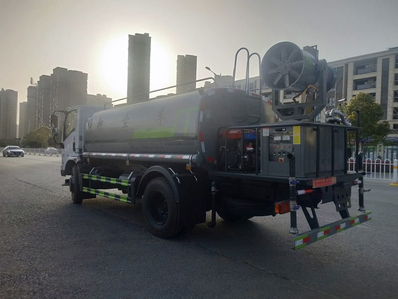 東風華神 T1 10 方抑塵車-灑水車產品配置 1.底盤配置: 發動機云內 150 馬力(四缸),萬里揚 6 檔變速箱,前橋 2.2 噸, 后橋 4.2 噸,8.25 鋼絲胎,軸距 3800,斷氣剎,ABS,空調,電動玻璃, 中控鎖。2.上裝配置: 1、罐體約為 10 方,可加裝 30 型霧炮 2、邊燈帶電,罐體尾部上方標配 2 個紅色示寬燈, 3、標配前噴為鴨嘴直沖,標配后沖,用戶可根據自己的需求,來調 整對沖位置。 4、花紋防滑平臺,炮筒后蓋為定制型螺栓卡扣, 5、前噴、后沖、后灑、側噴,綠化高炮開關球閥均采用 50 大通經 不銹鋼球閥, 6、新式軸承式水炮,更加耐用, 7、40-50 型水泵, 8、防腐法蘭墊片, 9、鋁制后灑,不易炸開 10、罐體自動焊(美國林肯焊機及電源),拼板自動焊接,封頭環 縫焊接,無氣孔,焊縫美觀。 11、側護網、后保險杠、均為螺栓連接,方便拆卸,維修方便。 12、塑料擋泥板,替代鐵擋泥板,更加輕便,用螺栓連接,方便拆 卸。 13、前部、后部主管連接處為 6 孔圓法蘭,不易沖墊