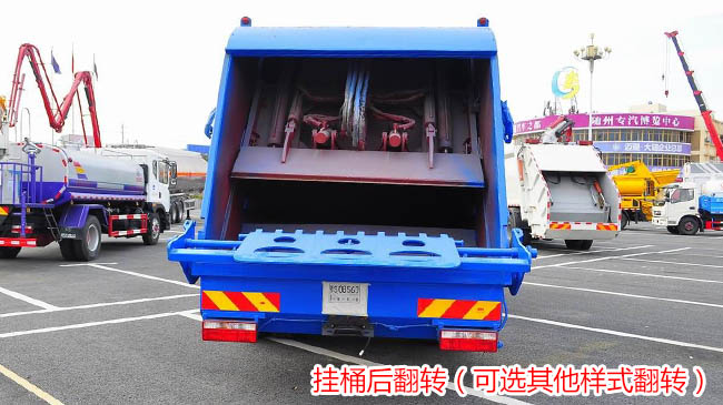 上裝配置:新款無筋條箱體,平面圓弧美觀大方,有效壓縮容積12方或14立方,尾部帶翻轉上料機構,電控手動雙操控器,駕駛室與車尾部雙控制箱,尾部帶3厘米厚橡膠密封壓條,帶污水收集槽,大容量污水箱。箱體可按要求噴繪圖案和字樣。