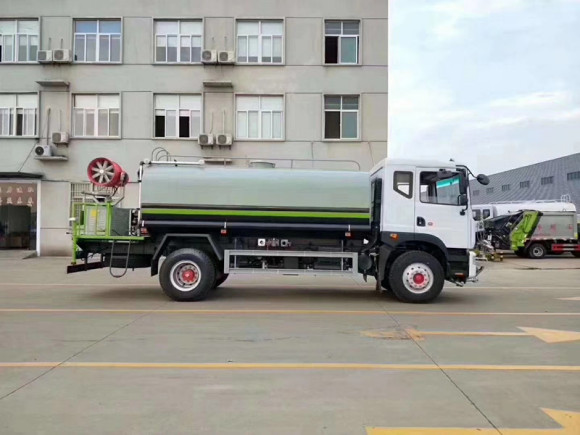 灑水車吸程≧7米,灑水寬度≧14-16米,射程≧25-40米,引水時間<5min,流量60m3/h。前沖(噴)、后灑、帶側噴(花灑)、帶后工作平臺、平臺上安裝綠化灑水高炮(炮噴射形狀可調節:直沖、大雨、中雨、毛毛雨、霧狀、可連續調節,360°旋轉),配消防接口,自流閥,濾網,帶自吸自排功能。配備大功率專用灑水泵,泵可自吸自排,安裝過濾網,帶消防接口,可通過消防栓進水,帶自流閥,此車尾部加裝大功率農藥噴灑炮,