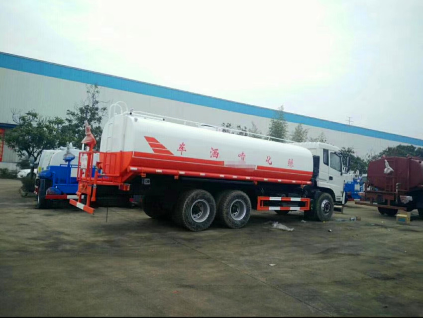 根據客戶要求:罐體容積約20立方;專用功能為:前沖后灑,帶側噴,帶高位花灑,罐體后帶工作平臺,平臺上安裝綠化灑水高炮,灑水炮可全方位旋轉,并有多種雨狀可調節(大雨、中雨、毛毛雨、霧狀),泵可自吸自排,帶自流閥,帶消防接頭,帶過濾裝置。