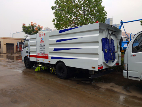 洗掃車采用東風五六(可選三)二類底盤改裝,加裝副發動機、風機、高壓水泵、清水箱、垃圾箱、左右立掃、帶噴水桿的寬嘴、低壓沖洗系統、垃圾箱自潔,掃盤降塵系統,液壓系統、專用裝置電控系統和副車架改制而成。