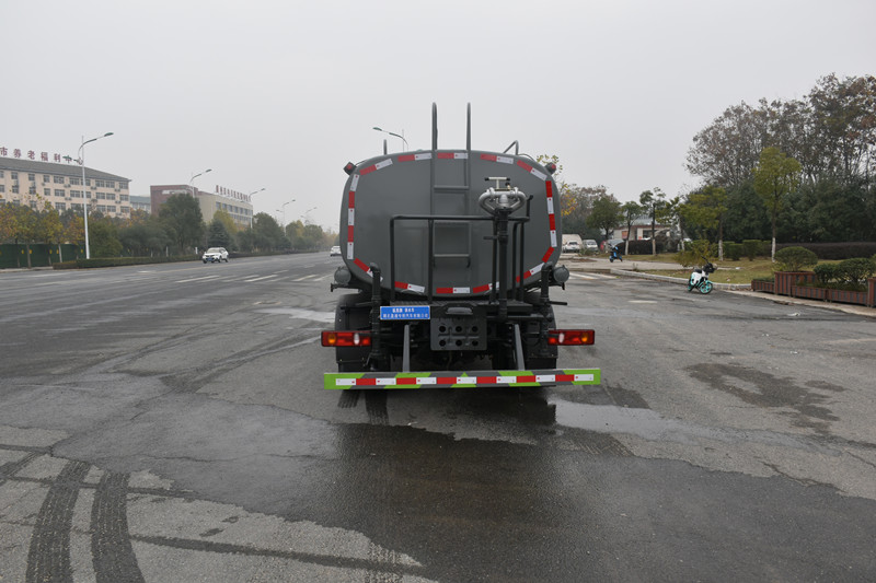 1、灑水車前裝有鴨形噴嘴或圓頭沖嘴,后面裝有圓柱開灑水噴嘴或蓮蓬頭噴嘴,后部有一工作平臺,裝配有水炮。后部還可裝8個噴嘴(選裝);
