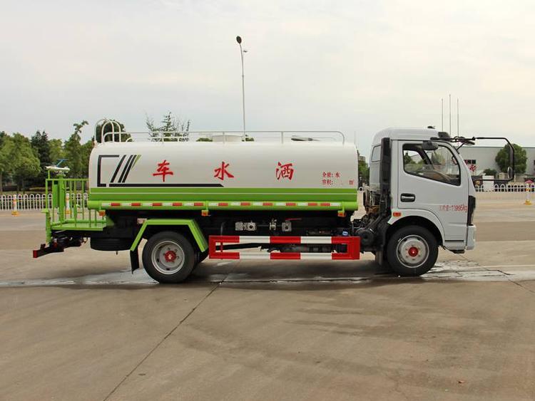 灑水車具有前沖后灑、側噴(更換噴頭后變為側花灑)、后置式工作平臺(帶踏梯,四周有安全護欄)、平臺上設置有高壓水炮(可360°旋轉,可調成柱狀射程28米,也可調成霧狀射程14米,可調成:直沖狀、大雨、中雨、小雨、毛毛雨),整車灑水寬度大于14米.配備大功率灑水泵,取力器,雜物過濾網,通用65型消防接口(可通過消防栓加水)、1套自流球閥系統(可自吸自排,吸程6米),2根引水鋼絲膠管(帶陰陽快速接頭),配鎖,水位計,作業高音喇叭.兩側及后加強型保險杠,防滑爬梯,膠管儲存筒.