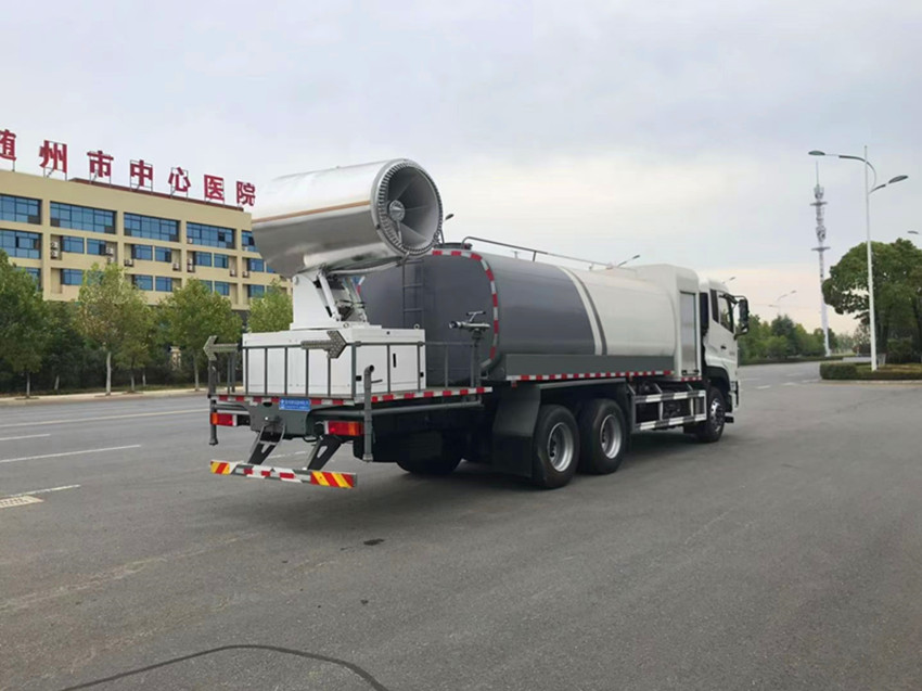 東風(fēng)天龍20噸灑水車,霧炮車具有前沖、后灑、側(cè)噴(更換噴頭后變?yōu)閭?cè)花灑)、后置式工作平臺(tái)(帶踏梯,四周有安全護(hù)欄)、平臺(tái)上設(shè)置有高壓水炮(可360°旋轉(zhuǎn),可調(diào)成柱狀最大射程28米,也可調(diào)成霧狀最大射程14米,可調(diào)成:直沖狀、大雨、中雨、小雨、毛毛雨),整車灑水寬度大于14米.配備優(yōu)質(zhì)大功率專用灑水泵,取力器,雜物過濾網(wǎng),國(guó)標(biāo)通用65型消防接口(可通過消防栓加水)、1套自流球閥系統(tǒng)(可自吸自排,最大吸程6米),2根引水鋼絲膠管(帶陰陽(yáng)快速接頭),配鎖,水位計(jì),作業(yè)高音喇叭.兩側(cè)及后加強(qiáng)型保險(xiǎn)杠,防滑爬梯,膠管儲(chǔ)存筒。