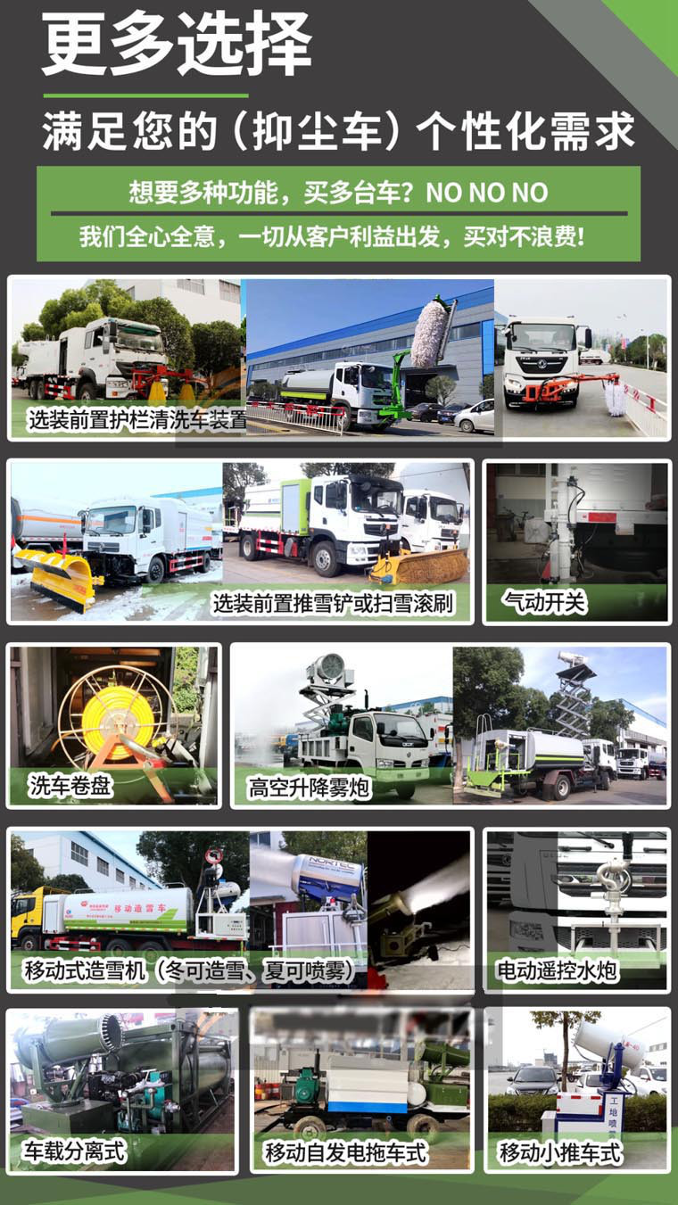 性能簡介:吸程≧7米,灑水寬度≧14-16米,射程≧25-40米,引水時間<5min,流量60m3/h。前沖(噴)、后灑、帶側噴(花灑)、帶后工作平臺、平臺上安裝綠化灑水高炮(炮噴射形狀可調節:直沖、大雨、中雨、毛毛雨、霧狀、可連續調節,360°旋轉),配消防接口,自流閥,濾網,帶自吸自排功能。安裝30-80米霧炮,霧炮可以遙控操作,可以手動操作,按霧炮大小配多大功率發電機