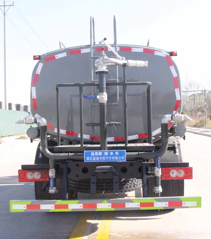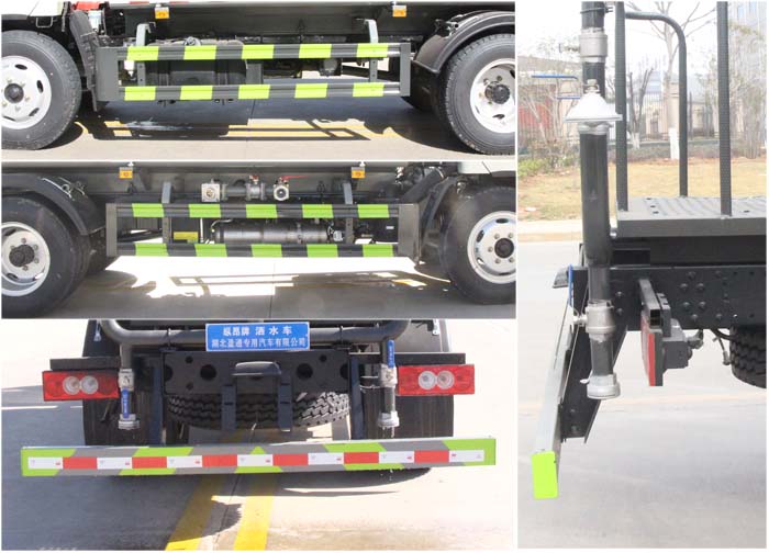 該車主要用于城鄉園林綠化,路面噴灑,除塵和降溫;主要裝置為罐體及噴灑裝置;罐體總容量7.56立方米,罐體有效容積:7.2立方米,罐體尺寸為(長×長軸×短軸)(mm):4200×2000×1310;ABS系統型號:ABS-VI.E;生產企業:廣州瑞立科密汽車電子股份有限公司.ABS系統型號:ABS-E;生產企業:威伯科汽車控制系統(中國)有限公司;側、后防護材料均為:Q235碳鋼,連接方式均為:螺栓連接,后部防護截面尺寸(mm):120×50,后部防護離地高度(mm):450.隨底盤選裝駕駛室;采用3800mm軸距.選裝前部電子炮樣式,選裝噴灑裝置樣式,選裝前部鴨嘴噴灑樣式,選裝罐體頂部高位花灑裝置,選裝氣動球閥安裝位置.選裝油箱電瓶安裝位置.選裝前部不帶電子霧炮.當前部不帶電子霧炮時,車輛長度7200mm,無前伸;當前部選裝電子霧炮時,車輛長度7700mm,前伸500mm.選裝箭頭燈裝置,后部作業燈僅在作業時開啟,車輛行駛過程中不可開啟.