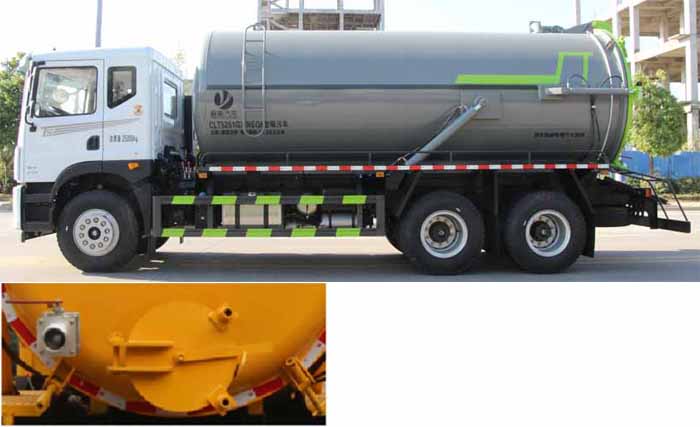 吸污車該車用于吸除水坑、下水道里污濁物;主要裝置有罐體及吸污裝置.該車具有舉升功能.罐體總容量:15.62立方米;罐體有效容積:14.88立方米;罐體外形尺寸(總長×直徑)(mm):6150×2000.側、后防護材料均為:Q235碳鋼,連接方式均為:螺栓連接,后部防護截面尺寸(mm):150×50,后部防護離地高度(mm):490.ABS型號/生產廠家:3631010-C2000/東科克諾爾商用車制動系統(十堰)有限公司,J ABS/焦作博瑞克控制技術有限公司.僅采用底盤4350+1350軸距(mm)改裝.選裝左邊樣式和后部出污口樣式.隨底盤選裝駕駛室.