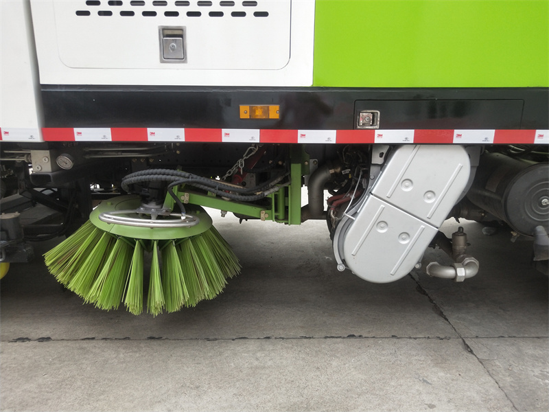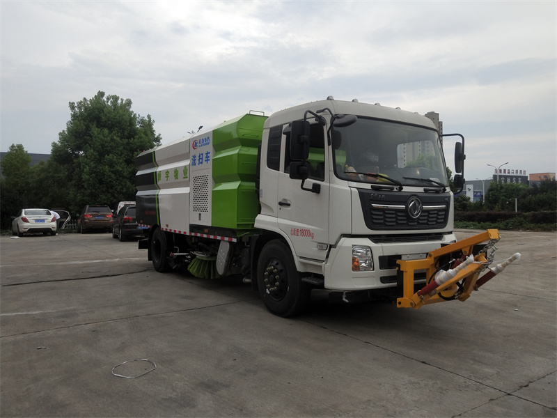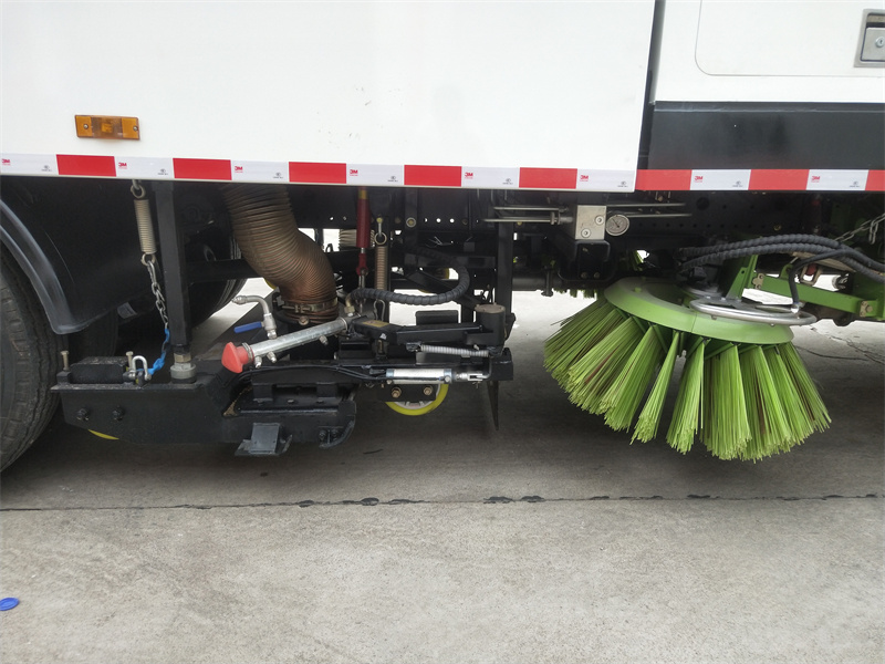 洗掃車采用中置兩刷盤,中置寬吸盤,配上具有防撞避障功能的V型高壓沖水架,組成一條大于3.5米的沖洗清掃帶。采用康明斯EQ6BT5.9-118型副發(fā)動(dòng)機(jī)現(xiàn)階段亦有采用電動(dòng)作為動(dòng)力的驅(qū)動(dòng)裝置橫置在車架中部,具有氣動(dòng)離合裝置控制的抽吸風(fēng)機(jī)布置在動(dòng)力倉的左側(cè)。采用不銹鋼材料加工而成的水箱與垃圾箱均為采用方形瓦棱結(jié)構(gòu)。水箱分為兩部位,一部分為前置獨(dú)立水箱,裝配在動(dòng)力倉的前部;另一部分為設(shè)置在垃圾箱前部的水箱,可隨垃圾箱與動(dòng)力倉罩同時(shí)升降。具有舉升功能的垃圾箱內(nèi)裝配有高壓沖洗噴頭,使得卸料更為輕松、干凈徹底。能夠隨垃圾箱體舉升的動(dòng)力倉罩可使動(dòng)力系統(tǒng)的維修保養(yǎng)極為便利。采用歐美地區(qū)的名優(yōu)配套部件,使得整車性能更為優(yōu)良,工作更為可靠。