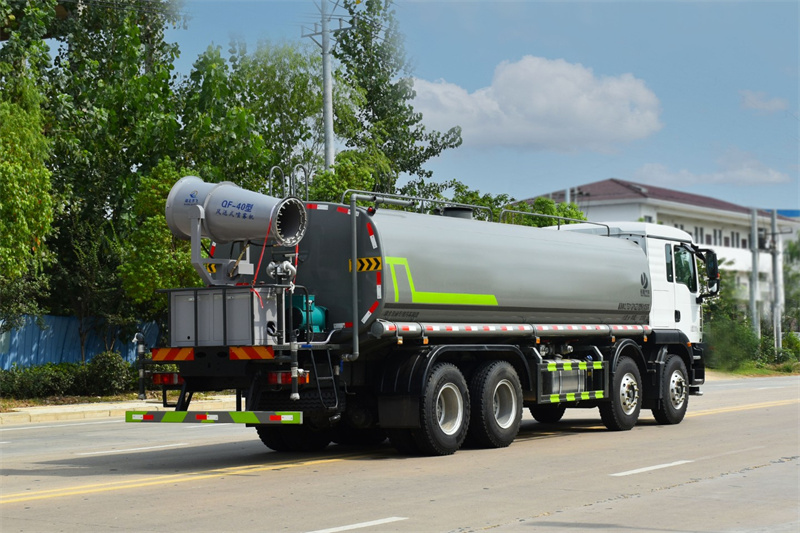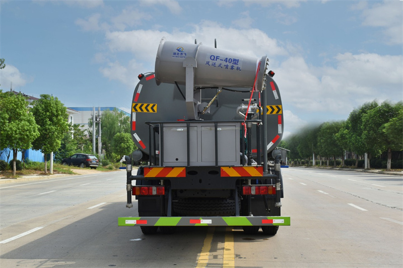 該車主要用于城鄉園林綠化噴灑作業.主要裝置為罐體及噴灑裝置;罐體總容量:19.67立方米;罐體有效容積:18.74立方米;罐體外形尺寸(長×長軸×短軸)(mm):7300×2450×1650.僅采用軸距(mm):1800+3800+1350改裝.側、后防護材料均為:Q235碳鋼,連接方式均為:螺栓連接,后部防護截面尺寸(mm):120×50,后部防護離地高度(mm):490.ABS系統控制器生產企業/型號為采埃孚商用車系統(青島)有限公司/4460046300;隨底盤選裝駕駛室,選裝噴霧裝置樣式,選裝自動球閥安裝位置,選裝弧形噴灑裝置,選裝箭頭燈裝置,選裝大工作平臺,選裝前部不帶電子霧炮.選裝電子炮裝置樣式.當前部選裝電子炮裝置時,前伸為500mm,整車長度為11560mm,11750mm.隨底盤選裝限速裝置,限速89km/h.