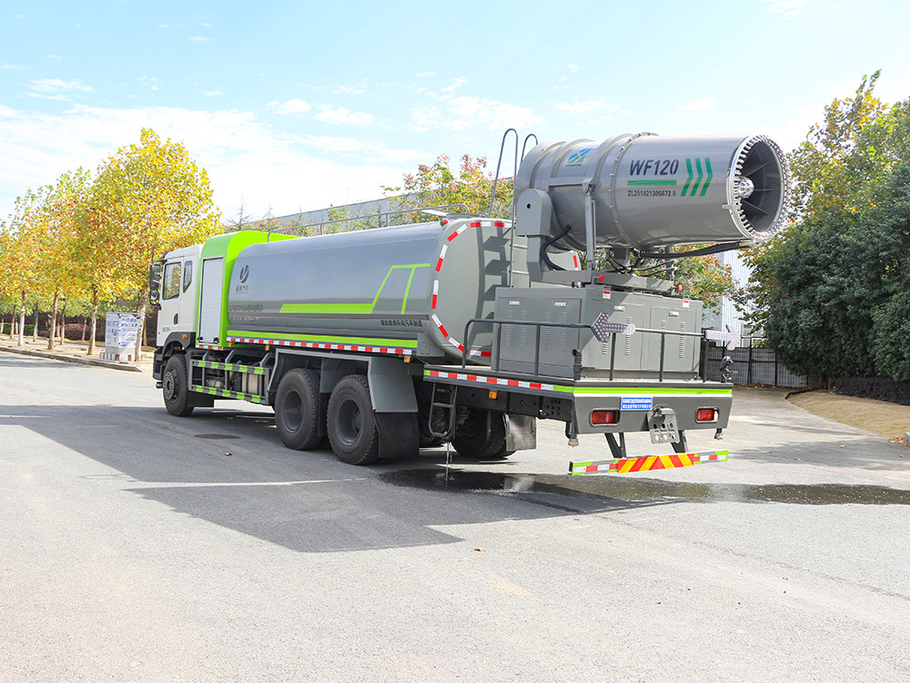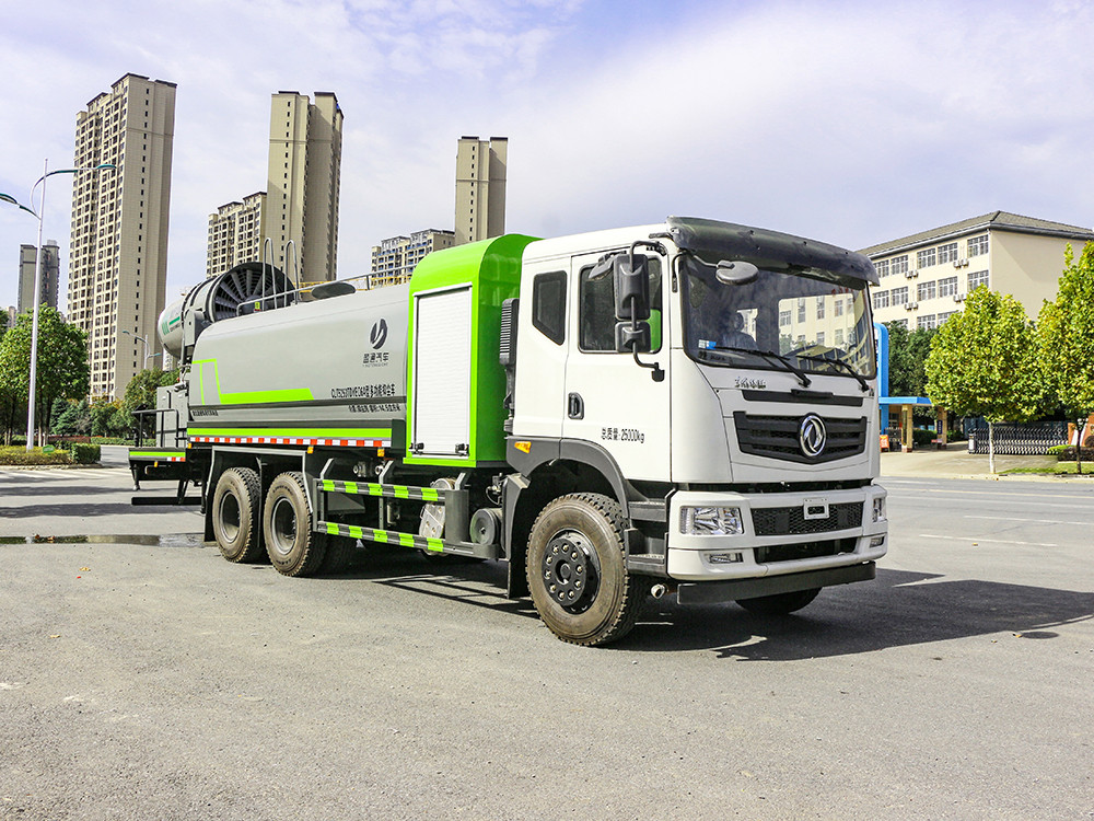 大型霧炮灑水車產品簡述及車型圖片 1.產品簡述:縱昂牌 CLT5253TDYEQ6A 型多功能抑塵車標配前噴(鴨嘴)、后 對沖、后灑、側噴、后置式工作平臺,平臺上配置綠化水炮(可 360°旋轉,既 可以調成柱狀,也可以調成霧狀),配備優質大功率專用灑水泵(可自吸自排, 可從河里或池塘抽水到罐體),取力器,雜物過濾網,消防接口,自流球閥系統、 取力器、球閥、濾網均為國家標準產品,主管道加粗,法蘭墊、法蘭盤加厚, 大通徑球閥。整體具備性能優良安全可靠、效率高、流量大、維修方便等特點