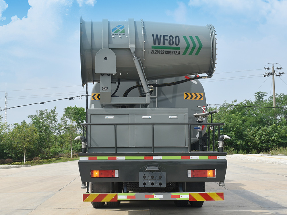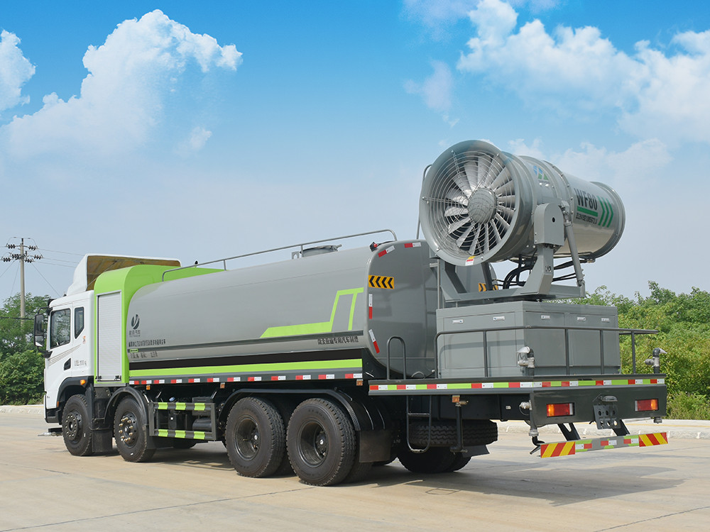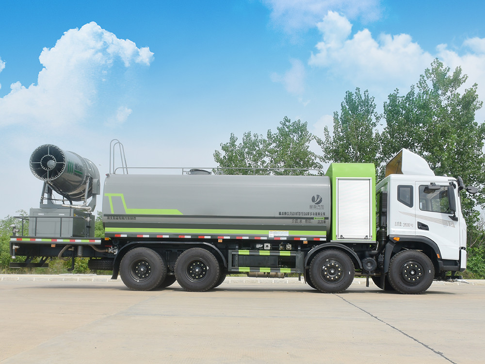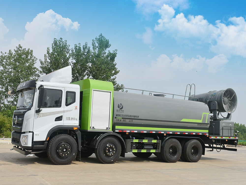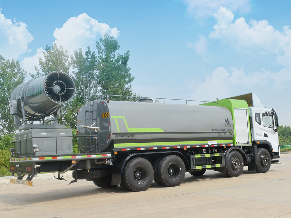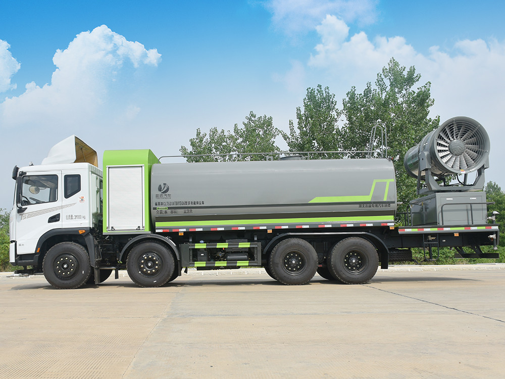 東風(fēng)20噸前四后八大型霧炮灑水車產(chǎn)品簡述:縱昂牌 CLT5310TDYEQ6 型多功能抑塵車標(biāo)配前噴(鴨嘴)、后 對沖、后灑、側(cè)噴、后置式工作平臺,平臺上配置綠化水炮(可 360°旋轉(zhuǎn),既 可以調(diào)成柱狀,也可以調(diào)成霧狀),配備優(yōu)質(zhì)大功率專用灑水泵(可自吸自排, 可從河里或池塘抽水到罐體),取力器,雜物過濾網(wǎng),消防接口,自流球閥系統(tǒng)、 取力器、球閥、濾網(wǎng)均為國家標(biāo)準(zhǔn)產(chǎn)品,主管道加粗,法蘭墊、法蘭盤加厚, 大通徑球閥。整體具備性能優(yōu)良安全可靠、效率高、流量大、維修方便等特點(diǎn)。