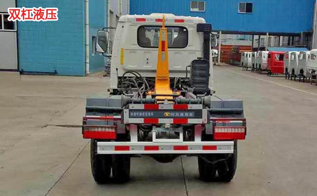 配套3~4立方米勾臂垃圾箱,拉臂材料為高強度碳鋼板,雙液壓油缸,采用國內知名油泵、油缸及多路閥。駕駛室外部操作,加強副梁,尾部帶有滾輪、垃圾箱鎖緊裝置,上藍牌。