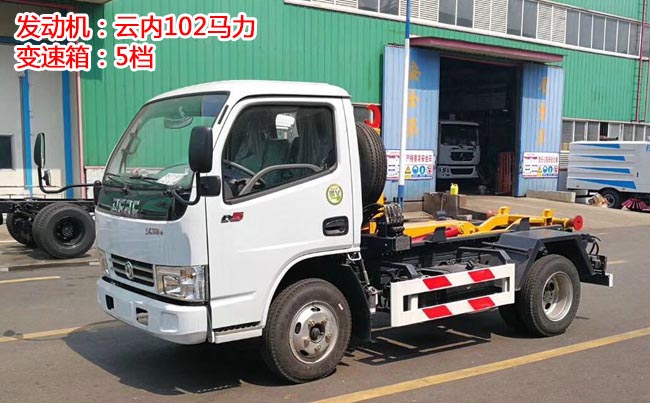 配套5~6立方米勾臂垃圾箱,高強度主勾臂,雙液壓油缸,采用國產油泵、多路閥、油缸,駕駛室外操作,尾部帶滾輪,箱體鎖緊裝置,鎖緊后可實現垃圾車自卸。