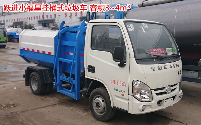 躍進小福星掛桶式垃圾車,南京躍進底盤,柳機88馬力發(fā)動機,5檔變速箱,軸距2.65米,185R14后雙輪輪胎,帶前盤制動,選裝空調,方向助力。