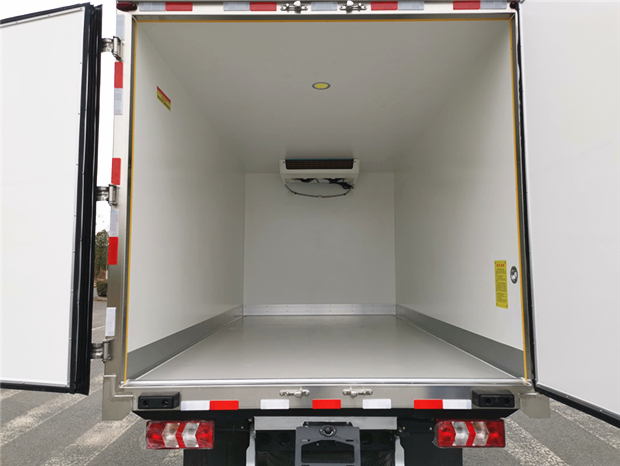 國六江淮駿鈴V5藍牌冷藏車廂體配置為:采用斷橋隔熱工藝,整體框架結構制作,廂體內、外壁材料為玻璃鋼板,采用高密度保溫層,廂板內帶有骨架,廂體厚度80mm,門框,門飾件、包角全部使用不銹鋼材質。最新款鋁合金包邊型材,廂體內采用LED照明燈及廂體示寬燈;門框密封條為橡膠材質,后門梁帶加厚防撞塊,加厚型不銹鋼鉸鏈及鎖件。車體副梁采用510L高強度鋼制作,底板為鋁花紋板,車廂后門帶一個上車扶手,其余標配;