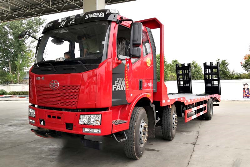 其他 解放前四后四平板運輸車采用J6L半浮平頂小排半駕駛室、自動空調、電動玻璃升降、手動后視鏡、駕駛員座椅為機械減振座椅、單DIN北斗兼容車載系統、車橋1928前軸,車橋Ф435沖焊橋(國產ABS),速比4.875,270×75×(7+5)mm車架,11.00R20型18層級,前下防護裝置、鐵保險杠、電動液壓舉升裝置、駕駛室抬高方案、300L鋼油箱、發動機體5萬公里長換油周期、防飛濺擋泥板、電調大燈。