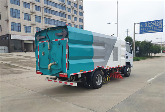 該洗掃車采用國六東風(fēng)多利卡二類底盤改裝,加裝副發(fā)動機、風(fēng)機、清水箱、垃圾箱、左右立掃、掃盤降塵系統(tǒng)、左右高壓側(cè)噴高、吸盤內(nèi)置高壓主噴桿、氣動系統(tǒng)、液壓系統(tǒng)、專用裝置電控系統(tǒng)和副車架等改裝而成。