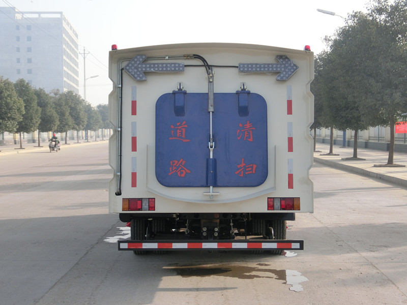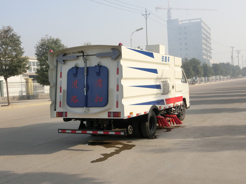 該掃路車采江鈴國五二類底盤改裝,加裝副發動機、風機、清水箱、垃圾箱、左右立掃、后置吸盤,掃盤降塵系統,液壓系統、專用裝置電控系統和副車架等改裝而成(可加裝前沖后灑)