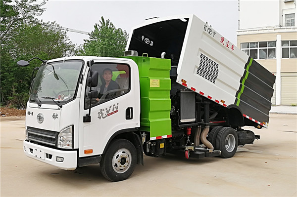 上裝配置:該車型在二類底盤上進行改裝,加裝副發(fā)動機、風機、清水箱、垃圾箱、掃刷、后置吸盤,掃盤降塵系統(tǒng),液壓系統(tǒng)、專用裝置電控系統(tǒng)和副車架等改裝而成。
