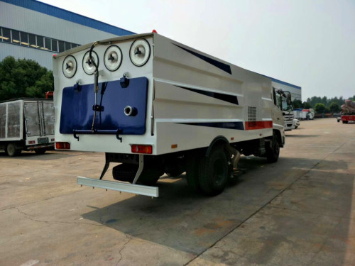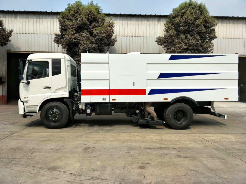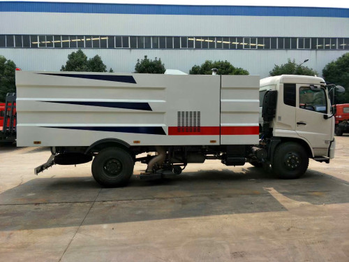 該掃路車采用東風(fēng)天錦型國五二類底盤改裝,加裝副發(fā)動(dòng)機(jī)、風(fēng)機(jī)、清水箱、垃圾箱、左右立掃、后置吸盤,掃盤降塵系統(tǒng),液壓系統(tǒng)、專用裝置電控系統(tǒng)和副車架等改裝而成(可加裝前沖后灑,可以根據(jù)客戶要求做成方形、圓形箱