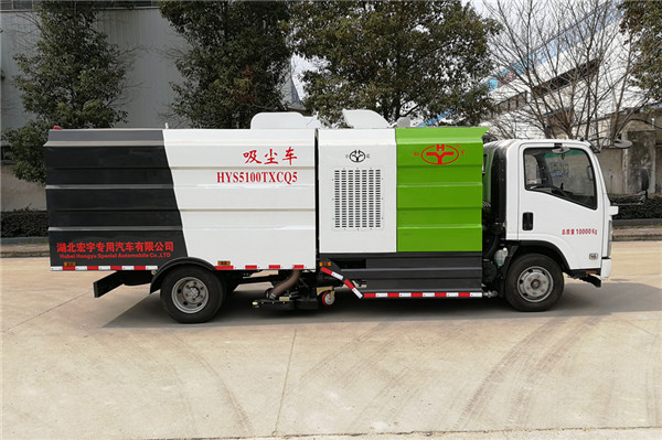 該吸塵車是采用五十鈴國五二類原廠汽車底盤改裝,加裝副發(fā)動機(jī)、風(fēng)機(jī)、清水箱、垃圾箱、中置吸盤,工作視頻探頭,自動脈沖清理功能,液壓系統(tǒng)、專用裝置電控系統(tǒng)和副車架等改裝而成。