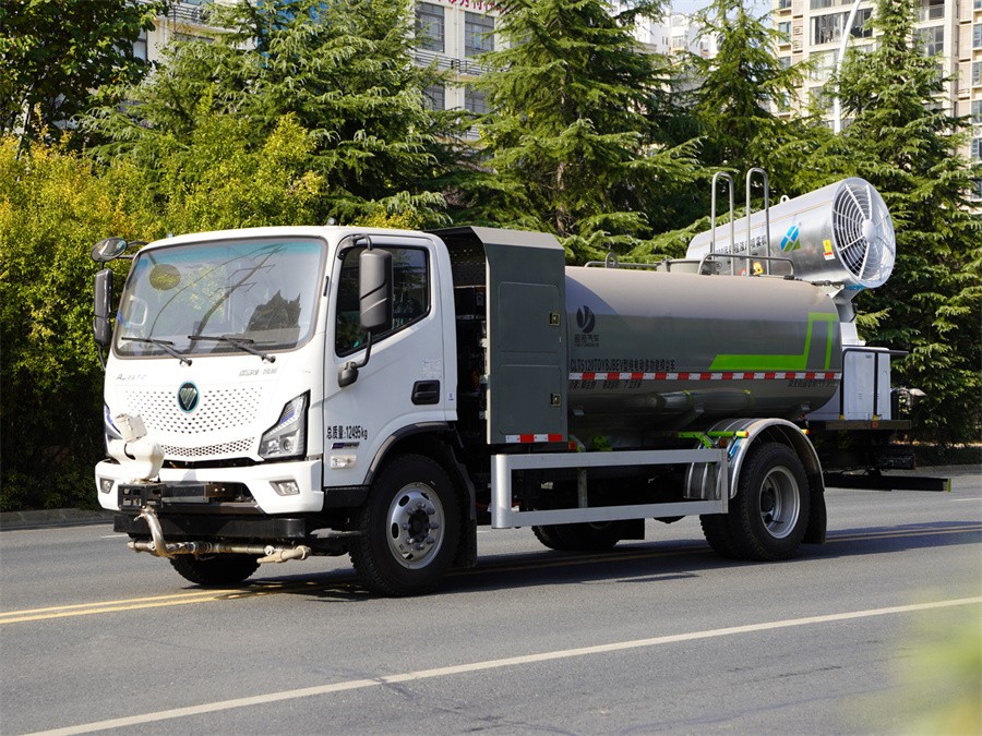 電動多功能抑塵車該車主要用于城鄉道路以及鐵路礦場的防塵除霾工作;主要裝置為罐體及抑塵噴霧裝置;罐體總容量:7.35立方米;罐體有效容積7立方米;罐體外形尺寸(長×長軸×短軸)(mm):3600×2000×1310;側防護材料為鋁合金+Q235碳鋼,連接方式為螺栓連接;后防護材料為:Q235碳鋼,連接方式為:螺栓連接;后防護截面尺寸:120×50mm,后部防護離地高度(mm):440;ABS系統型號/生產企業:ABS-VI.E/廣州瑞立科密汽車電子股份有限公司;電池種類:磷酸鐵鋰電池,儲能裝置單體生產企業:寧德時代新能源科技股份有限公司,儲能裝置總成生產企業:寧德時代新能源科技股份有限公司;電機型號/生產企業:FTTB080C/北汽福田汽車股份有限公司,額定功率:80kw,峰值功率:160kW;選裝前部不帶電子水炮,該狀態下車長為8060mm;當前部安裝電子水炮時,車長為8560mm,車輛前伸500mm;選裝電子水炮樣式.隨底盤選裝駕駛室,選裝噴霧裝置樣式,選裝箭頭燈裝置.