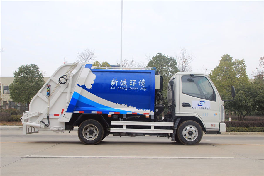 上裝效壓縮容積3-4立方,可裝3噸生活垃圾,壓縮倍率5:3倍,壓縮后生活垃圾密度從0.36變為0.96以上,帶污水收集箱,新款平板式箱體更美觀,尾部帶密封橡膠圈,可防污水滴漏二次污染。尾部可帶翻轉斗或掛桶裝置,可選裝駕駛室和尾部雙操控系統。