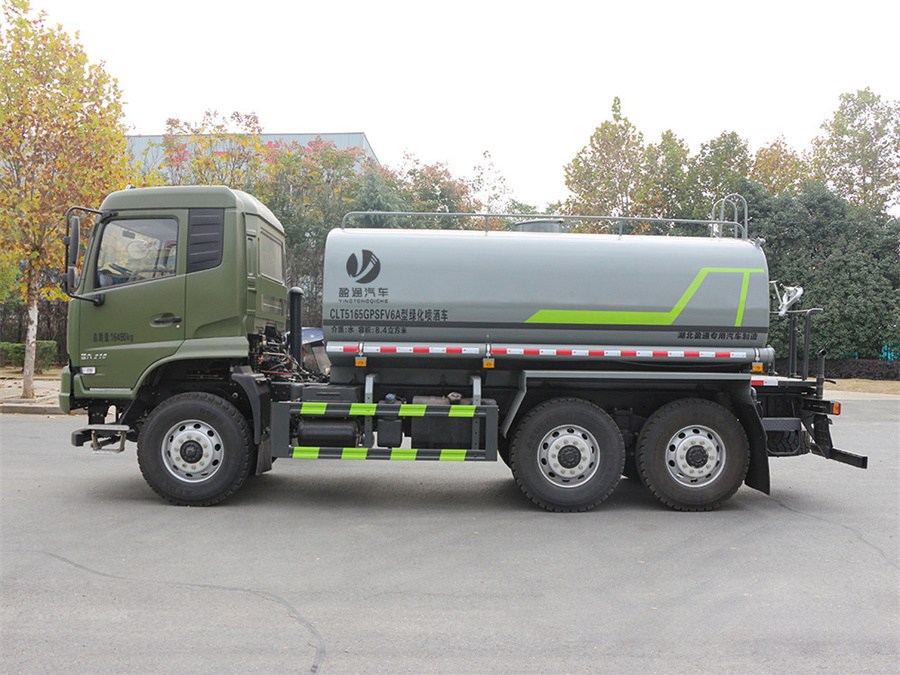 灑水車產品標配前噴(鴨嘴)、后沖、后灑、側噴、后置式工作 平臺,平臺上配置綠化水炮(可 360°旋轉,既可以調成柱狀,也可 以調成霧狀,更可以調成直沖狀、大雨、中雨、小雨、毛毛雨),配 備優質大功率專用灑水泵(可自吸自排,可從河里或池塘抽水到罐體), 取力器,雜物過濾網,消防接口,自流球閥系統、取力器、球閥、濾網 均為國家標準產品,主管道加粗,法蘭墊、法蘭盤加厚,大通徑球閥。 整體具備性能優良安全可靠、效率高、流量大、維修方便等特點