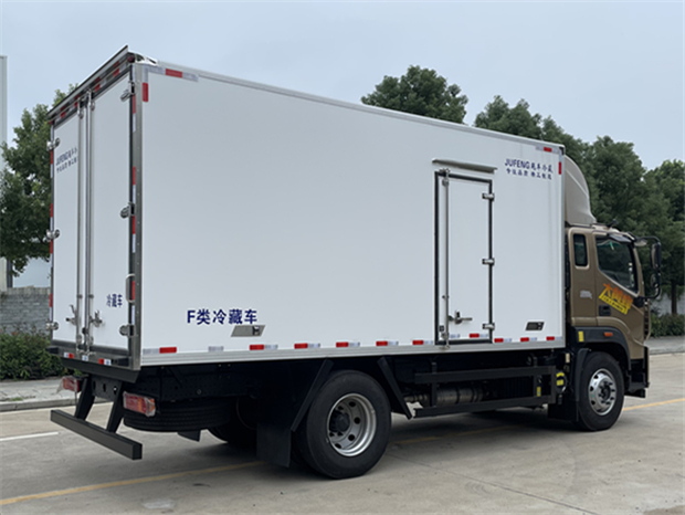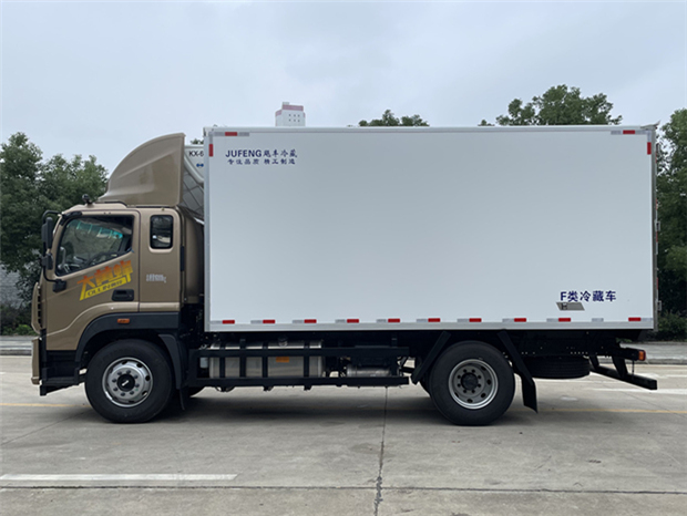奧鈴大黃蜂6米8冷藏車廂體配置為:斷橋隔溫工藝,整體結構框架,內外面料為3mm新款啞光玻璃鋼夾保溫層真空復合而成,廂體厚度為8cm,最新款鋁合金包邊型材,型材局部厚度為4mm(鋼制鉚釘加固),廂體內部采用2個LED照明燈及廂體示寬燈,后門框不銹鋼材質,門框密封條為三元乙丙橡膠材質,加厚型不銹鋼合頁及鎖件;副梁為Q700車用大梁鋼,15mm厚大梁墊皮,加裝防撞膠塊,不銹鋼門鎖件,配后雙開門,副駕駛一側居中靠前開單側門一個,帶2個排水孔。