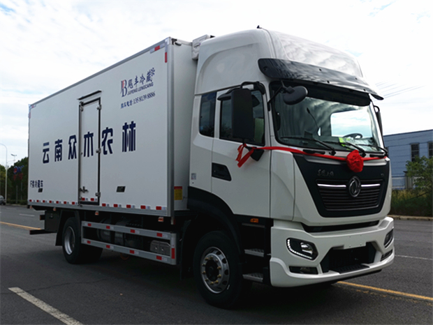 東風天錦6米8冷藏車-國六290馬力,整車型號為:DFH5180XLCEX7,發動機型號為:D6.7NS6B290,整車外形尺寸:9200×2600×3960mm,箱體尺寸6800×2440×2450mm,總質量:18000Kg,整備質量:7880Kg,額定質量為:9990Kg.