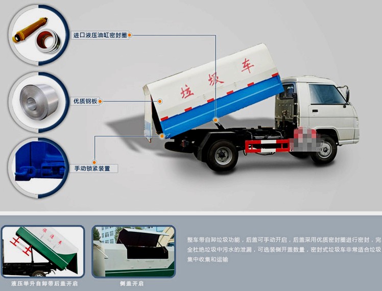 密封式垃圾車又稱自卸式垃圾車,主要由汽車底盤、箱體、開門機構、舉升機構、電液控制系統等組成,是一種新型機、電、液一體化的全密封結構垃圾運輸車輛,它不但可與LSY系列垃圾站配套使用,也可廣泛用于城鎮居民生活區、工業區、商業區、學校、公園、風景區等場所的垃圾運輸工作